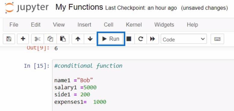 創建這些變量後,按Shift + Enter加載它們。接下來,我們將開始定義我們的函數,並將其命名為“ is_approved ” ,參數為name、salary、side和expenses。