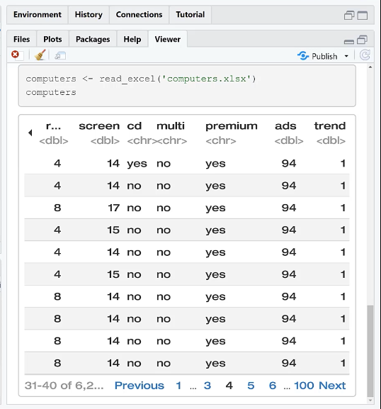 然後我們將在 Excel 中讀取一個文件並使用 R 將其導入。如您所見,數據看起來已經很不錯了,這是 R Notebooks 的另一個很酷的地方。