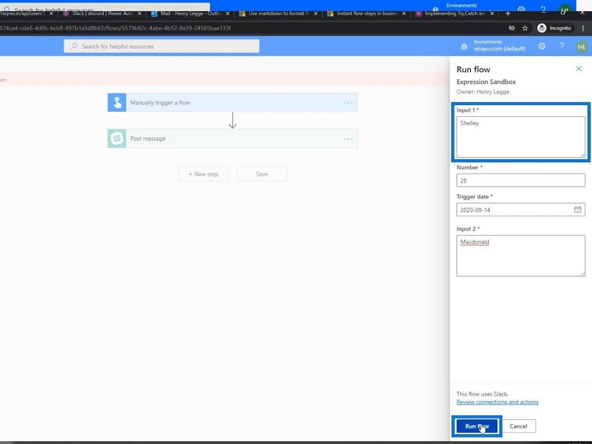 只需為其他輸入輸入任何內容。對於輸入 3,我們輸入“ [email protected] ”。然後點擊運行流程。