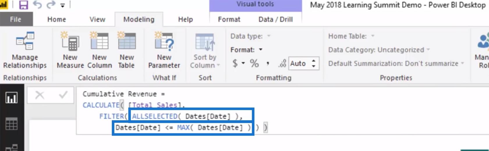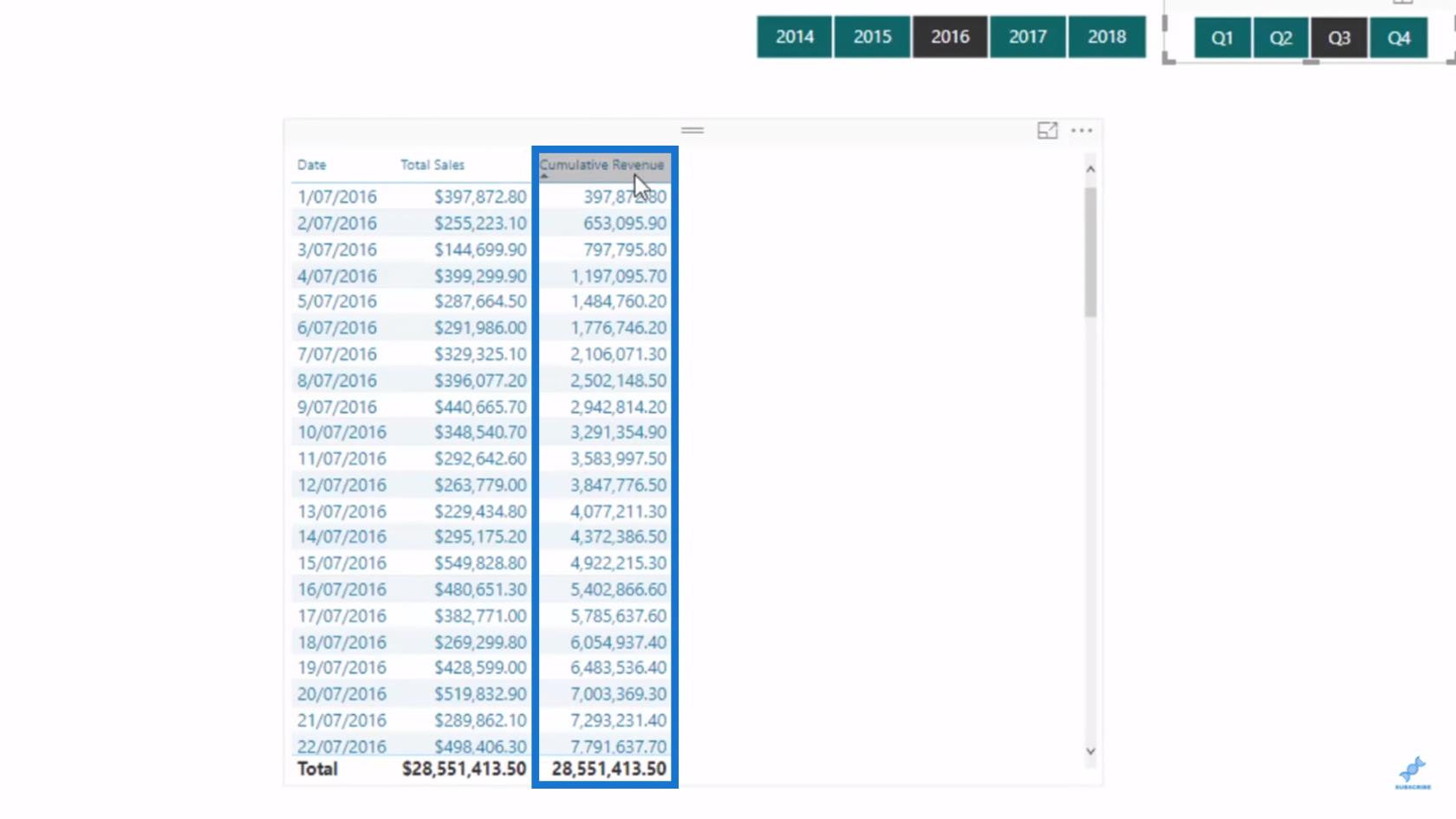 Cumulative Revenue列中的每一行都根據放置在Sales 表上的不同上下文或篩選器進行評估。