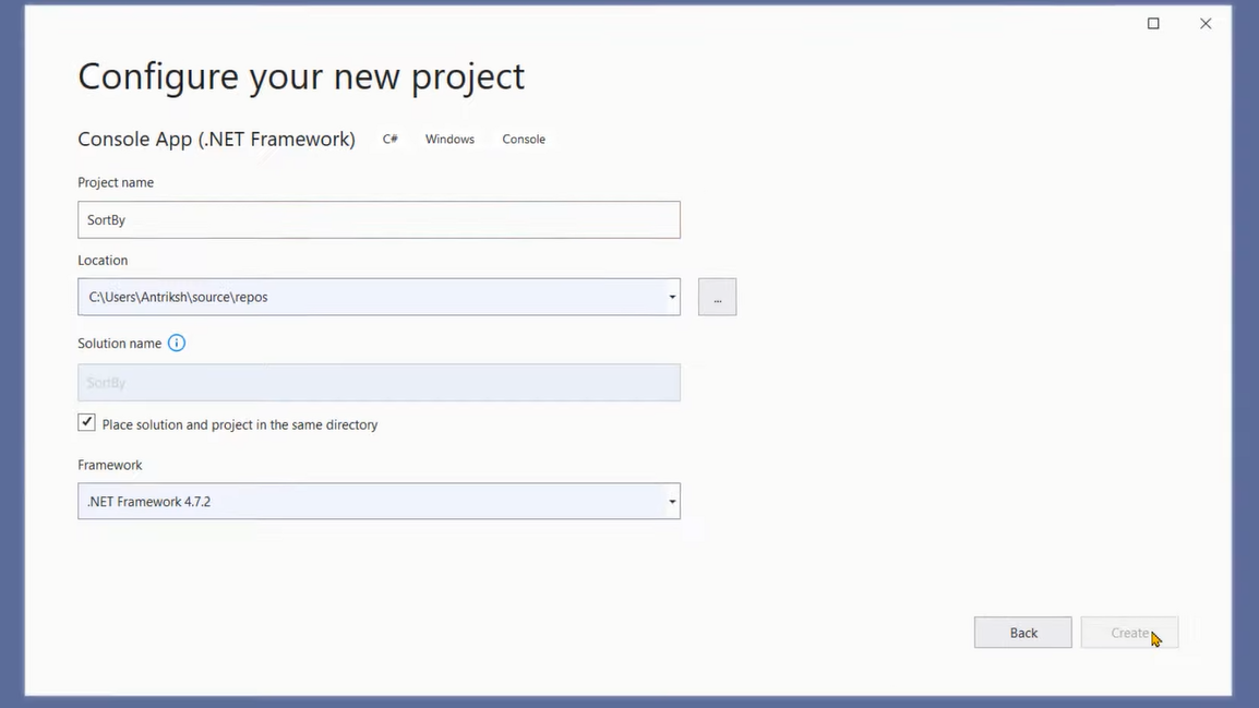 首先,我們需要在 Visual Studio 中創建一個新項目,這將是C# 語言的控制台應用程序(.Net Framework) 。讓我們選擇單擊下一步。