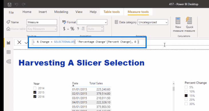 因此,我將在這裡創建一個新度量,我將其稱為% Change。然後,我將使用SELECTEDVALUE DAX 函數並獲取我的百分比變化( Percent Change ) 列。