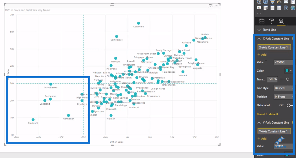 在分析功能中,我真正喜歡的是我們可以在圖表中放置一條常量線,這樣我們就可以創建一個網格。當我們在散點圖中有相當多的信息時,我們想把它分成四個網格。