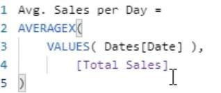此度量是針對每天的平均銷售額。 函數中使用虛擬表或物理表 來創建不同日期的列表。