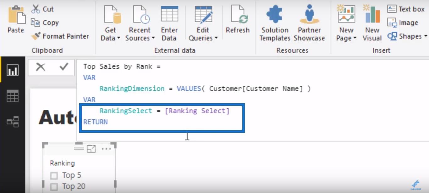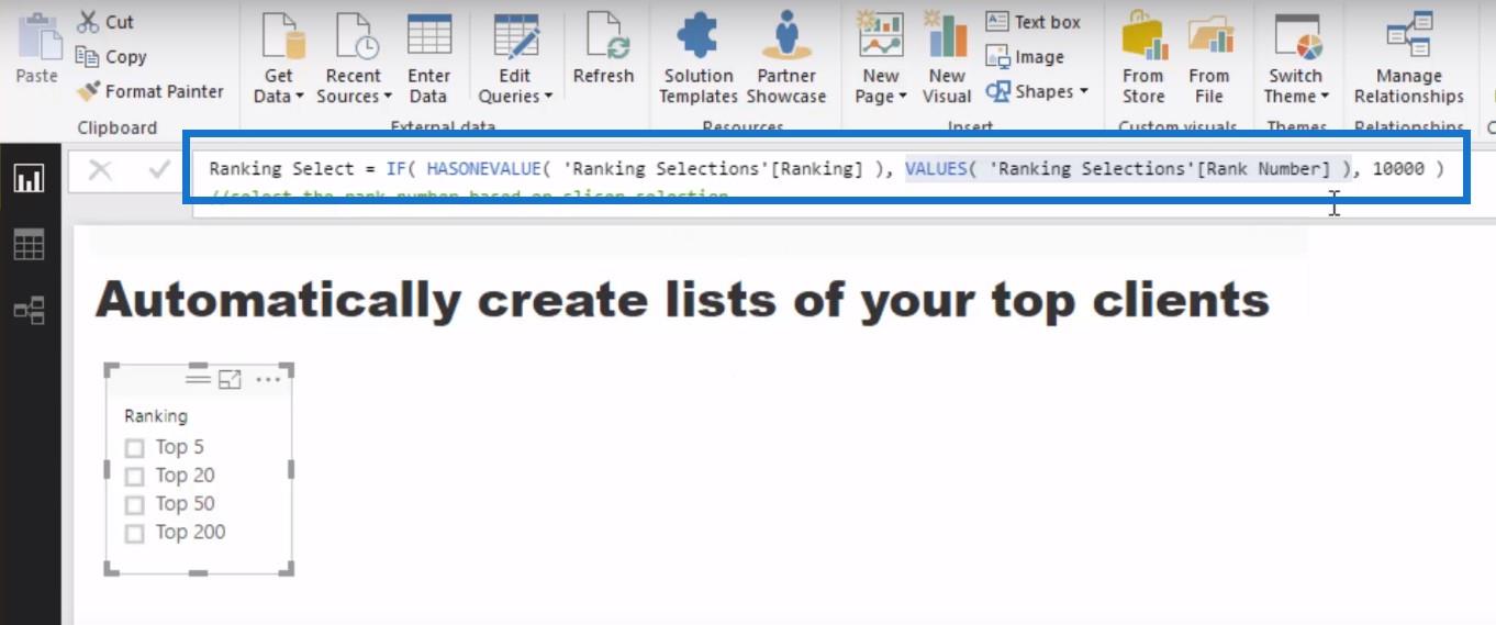 然後我將添加排名選擇,它將獲取我們希望在這些可視化中看到的客戶數量。然後我將在此處鍵入RETURN,因為這是您在使用變量時需要對公式進行四捨五入的操作。