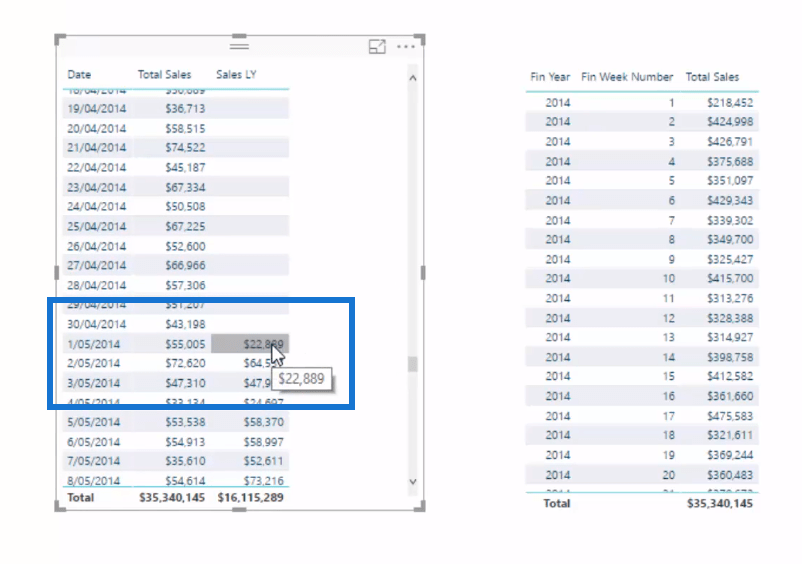 理論上,您會認為此金額將與 2014 年第一周的金額相同,但這並不是因為該財務週數字上的日期未對齊和重疊,因此我們需要一些自定義邏輯在這裡使這項工作。