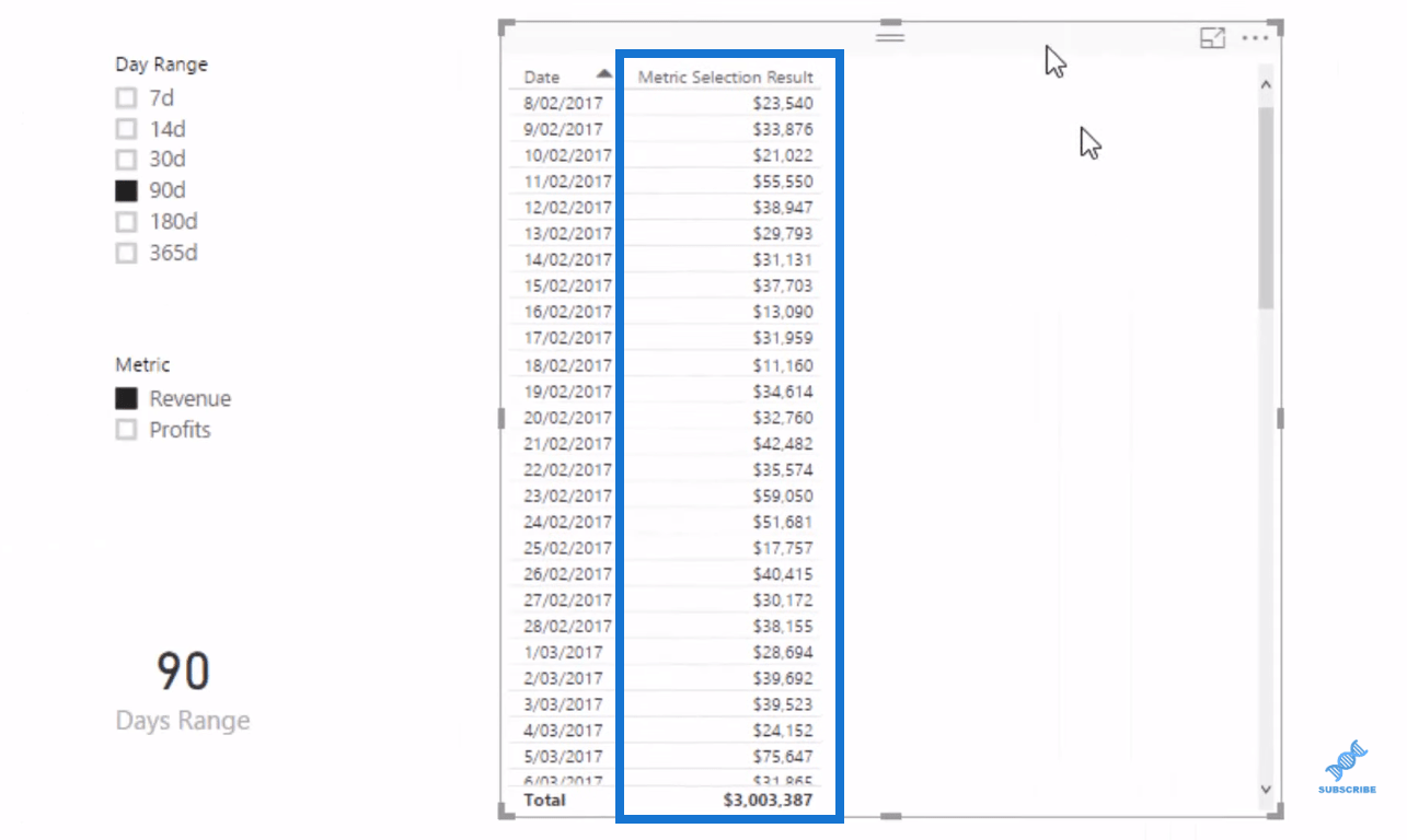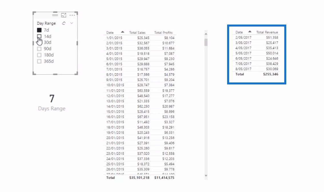 此邏輯使用語句。這將計算總銷售額,但只計算特定時期。我們可以通過在Dates表上使用來創建該時間段。如果日期大於 (>) TODAY,減去Days Range,並且如果日期小於 (<) or="" equal="" (=")" to="" today, itll= "" show="" the="">