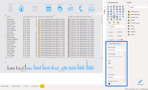 為此,您轉到 Table visual 並在格式部分的底部右下,您可以在其中看到Visual Tooltip。您可以將工具提示頁面嵌入到可視標題工具提示中。因此,在此報告頁面中,它是一個工具提示 GIF。