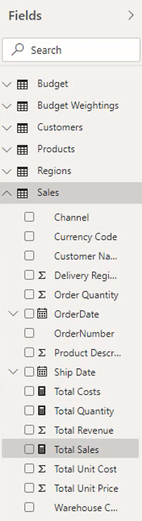 接下來,引用Sales 表,我們現在將有另一個計算我們銷售總量的度量。