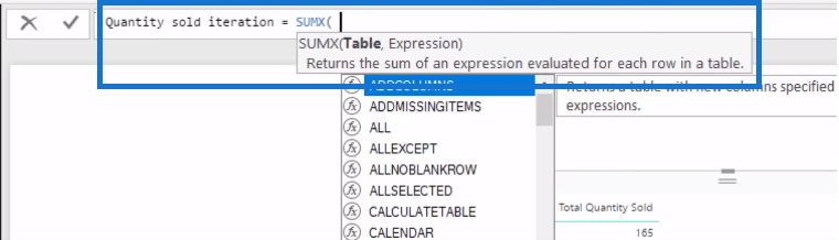 迭代函數的示例包括SUMX、AVERAGEX、MANYX和COUNTX。在這種情況下,我們將使用SUMX。