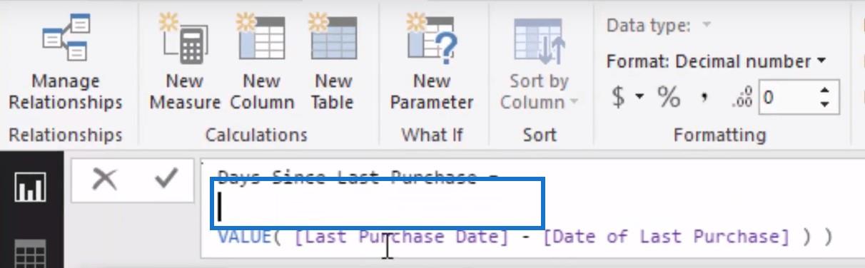 要獲得自上次購買以來的天數,我們所要做的就是從上次購買日期中減去上次購買日期。我們通過使用以下公式創建一個度量來做到這一點: