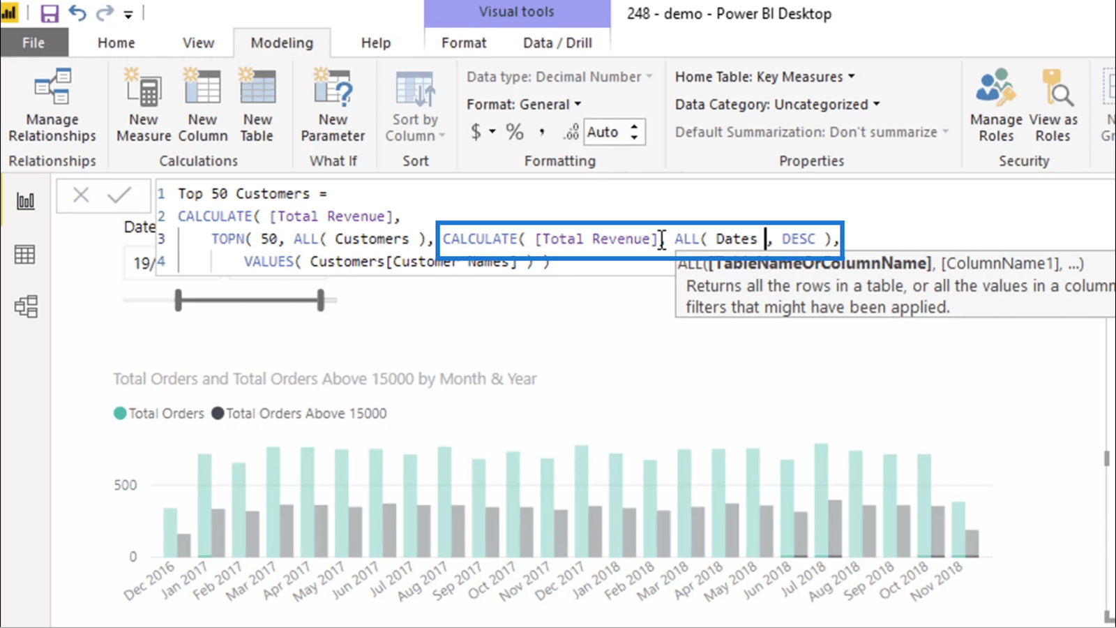 由於我正在查看我的前 50 名客戶,這些客戶是根據他們從一開始就購買的,所以我將包括日期。使用ALL函數會忽略可能已放置在日期切片器上的所有其他過濾器。