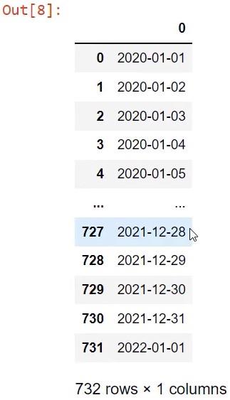 如果將結束日期更改為2021 年 1 月 2 日並將默認頻率從D(每天)更改為H(每小時),則日期列表將顯示每小時範圍。