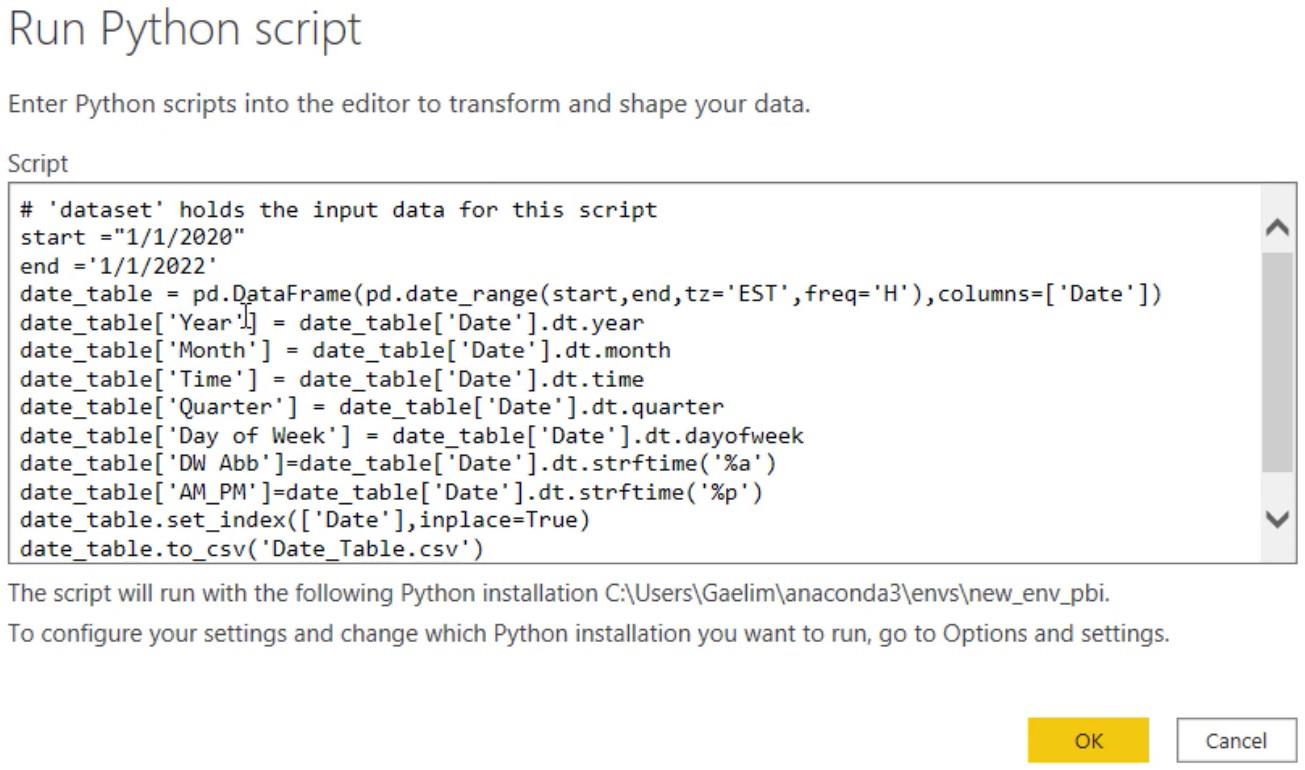 接下來要做的是重置索引。再次單擊 Run Python Script 步驟旁邊的齒輪圖標並輸入date_table.reset_index(inplace=True)。該函數將提取設置為索引的日期。