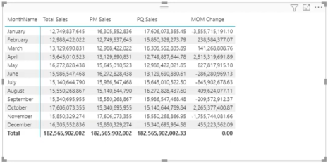 我們可以在矩陣視覺中填充它並按月份名稱對其進行分析。我還將添加我們當前的總銷售額、上個月的銷售額、上一季度的銷售額以及月環比變化。