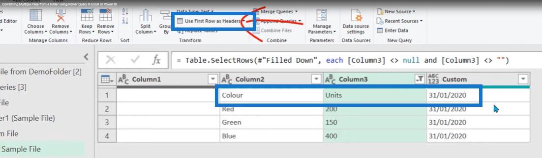 我們將點擊第一個文件,然後點擊Transform Sample File。我們對這個文件所做的任何更改,它也將應用於其他文件。