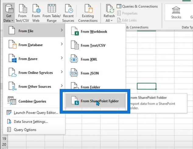 我們將從 power query 教程開始,將來自多個文件夾的文件與一個空 Excel 文件組合起來,然後轉到數據選項卡,依次單擊獲取數據、來自文件和來自文件夾。