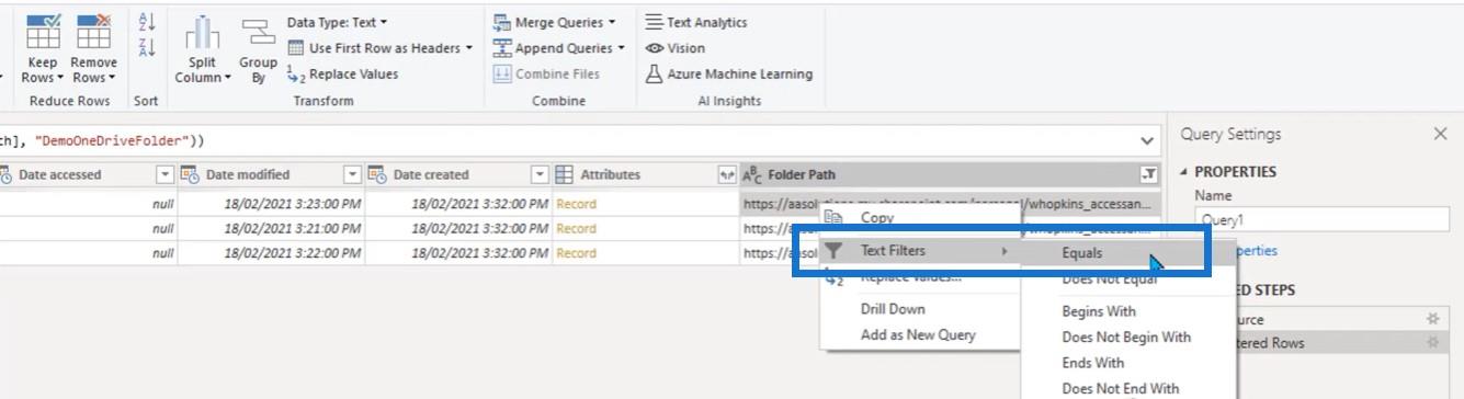 我們將轉到Folder Path列,右鍵單擊,轉到Text Filter,然後選擇Equals。