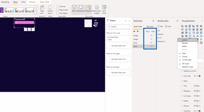 從這裡開始,由於我們在 PO 視圖 (PO v2) 上,我們將通過單擊那裡的隱藏(眼睛)按鈕來隱藏它。我們還將通過單擊切片器並將其隱藏來隱藏材質。然後,單擊書籤上的更新。