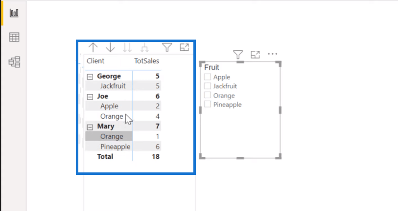 他想要一個具有多選功能的切片器,這樣如果你選擇了橙子,它會拉出所有購買橙子的客戶,但它也會顯示他們還購買了什麼。