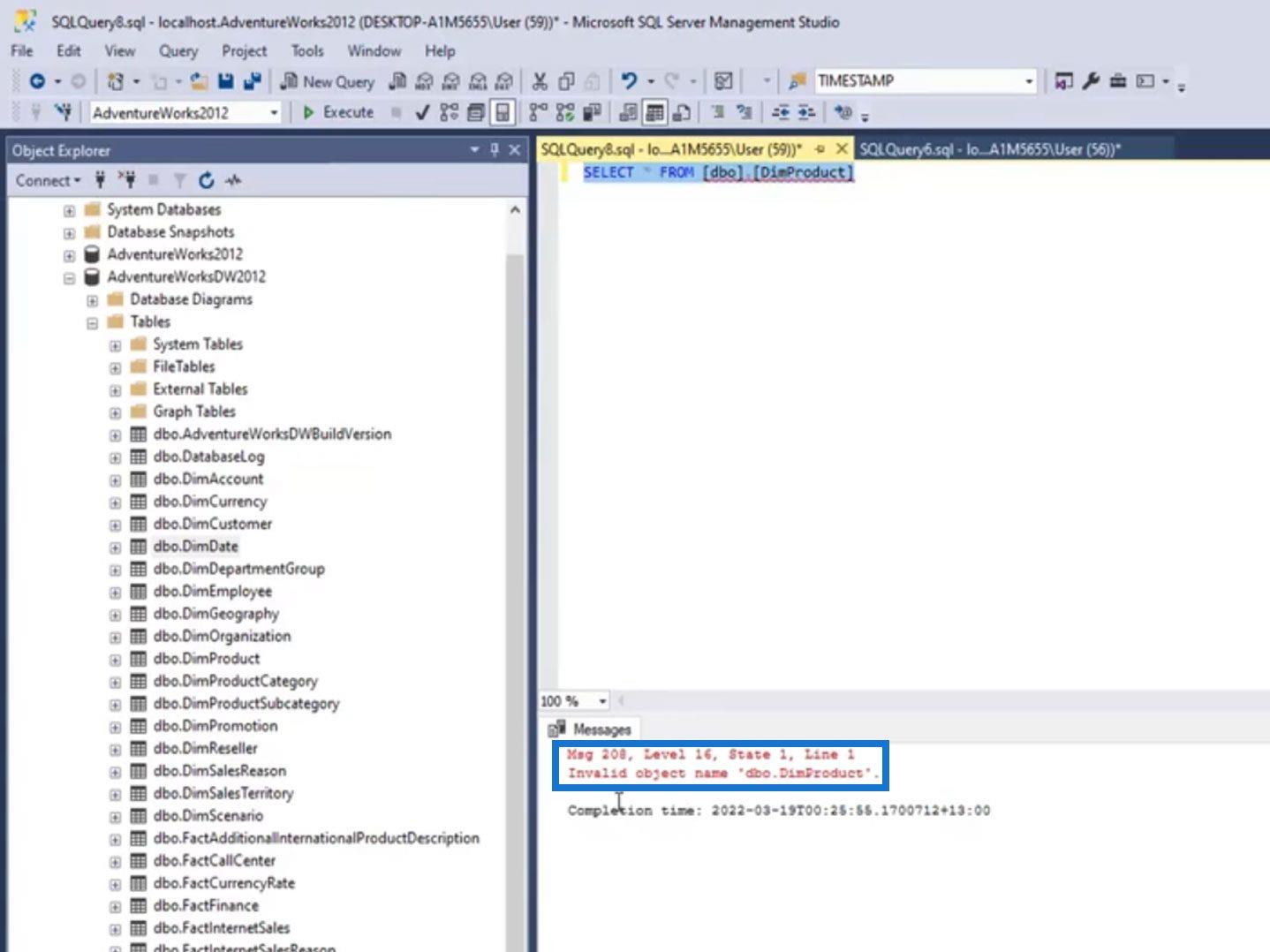 對於此示例,我們正在訪問AdventureWorksDW2012下的表,但當前選擇的數據庫是AdventureWorks2012。