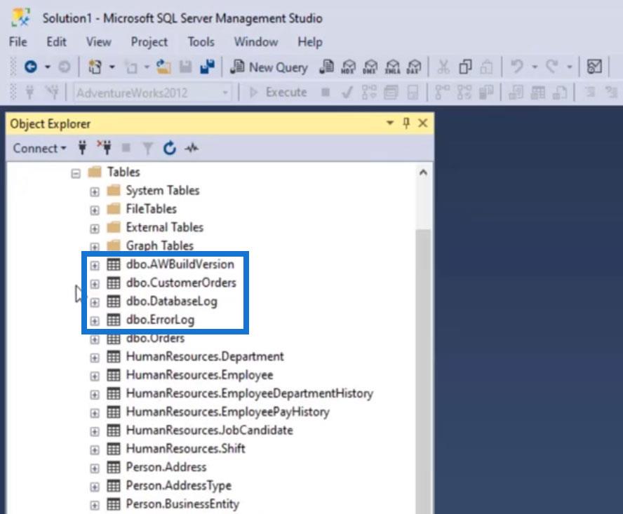 如果我們創建一個表並且我們不應用Schema,默認情況下會應用dbo 。對於此示例,沒有任何特定架構的表(如AWBuildVersion、CustomerOrders、DatabaseLog、ErrorLog和Orders)被設置為dbo。