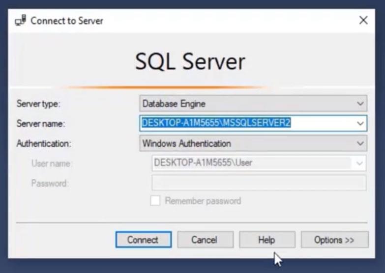將出現一個對話框,詢問服務器類型、名稱和身份驗證。