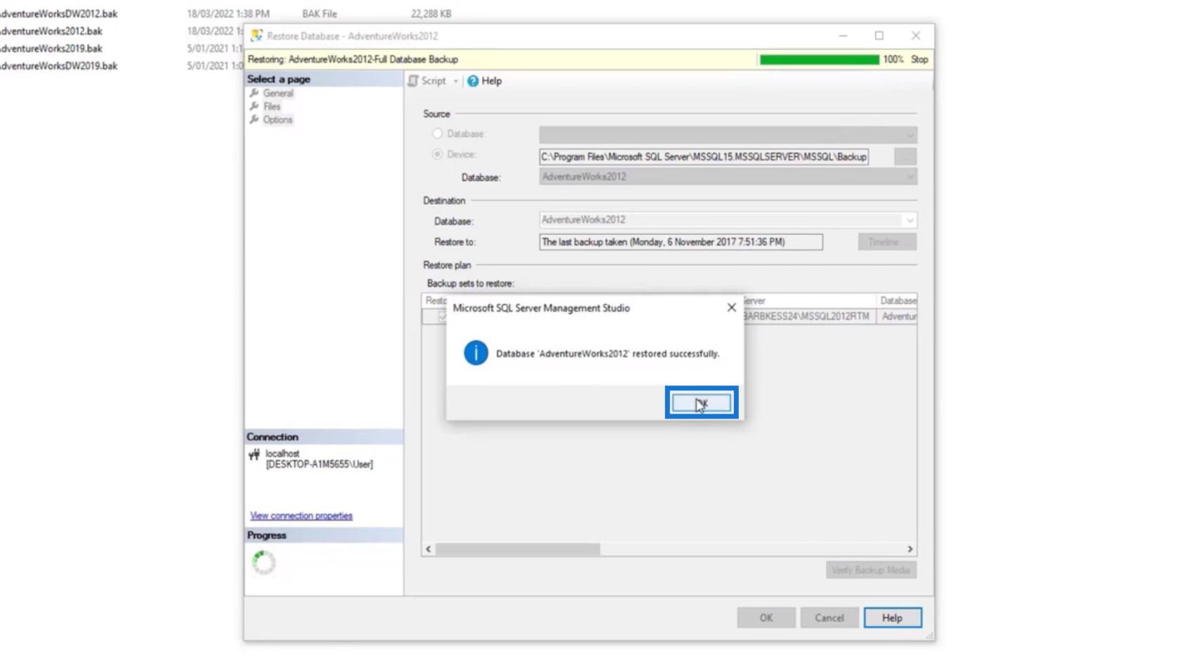 使用相同的步驟,讓我們也恢復AdventureWorksDW2012數據庫。
