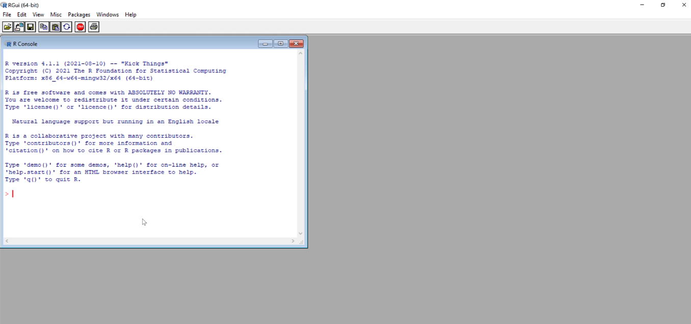 打開符合您計算機規格(x64 或 x32)的4.1.1 R 程序。在這種情況下,讓我們打開R x64 4.1.1。這就是 R 程序現在的樣子: