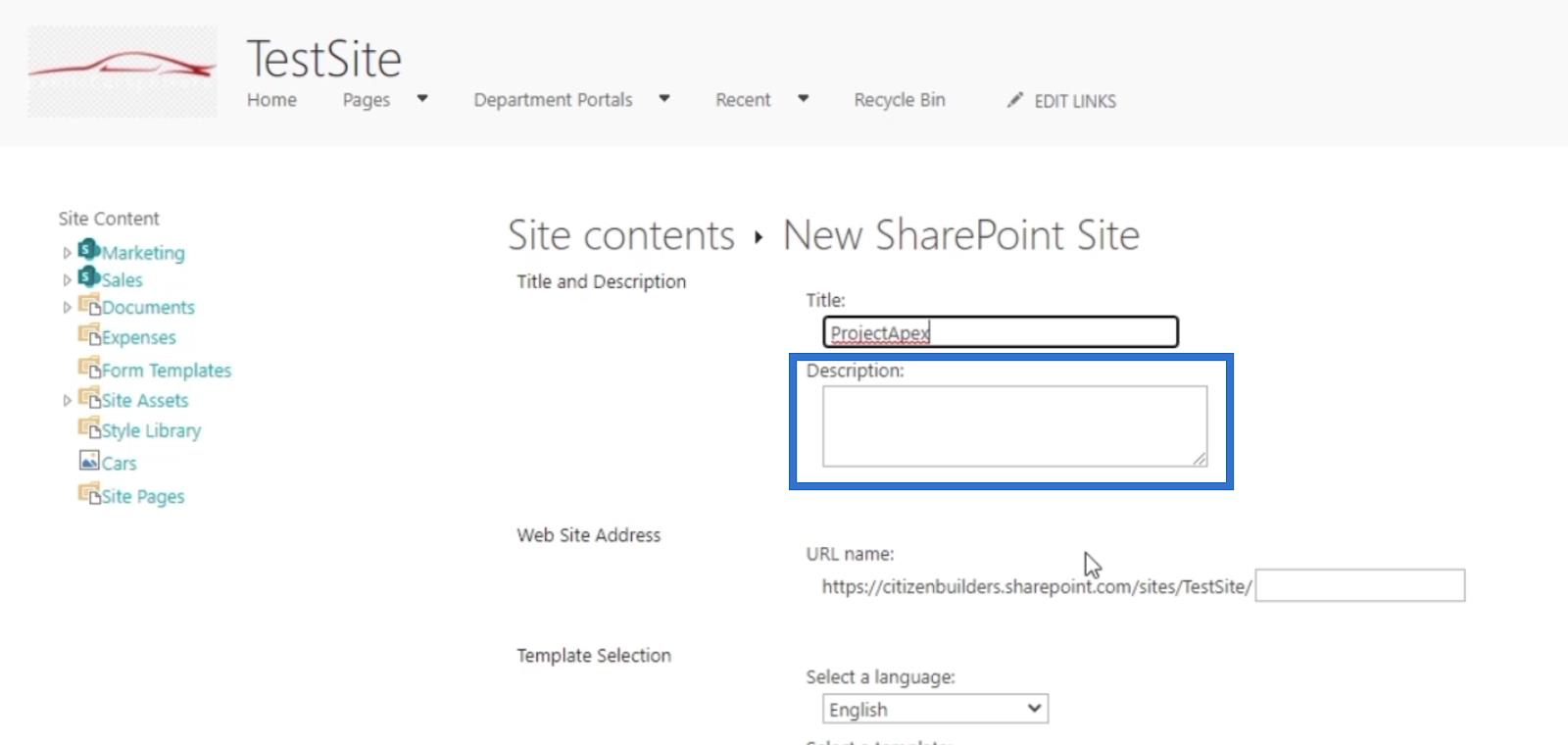 要開始製作項目網站,您必須確保您位於頂級網站上。在我們的示例中,我們使用The Best Car Company作為我們的頂級站點。