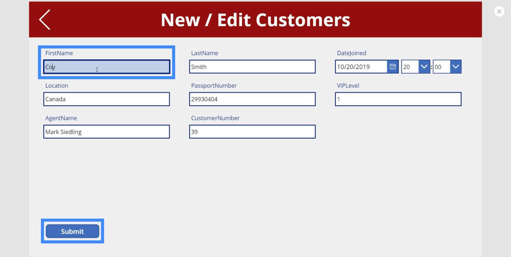 因此,讓我們轉到 FirstName 字段並在屬性下拉列表中選擇 OnSelect。然後,讓我們使用 UpdateContext 並引用 Submit 變量。然後,我們將其設置為 false。