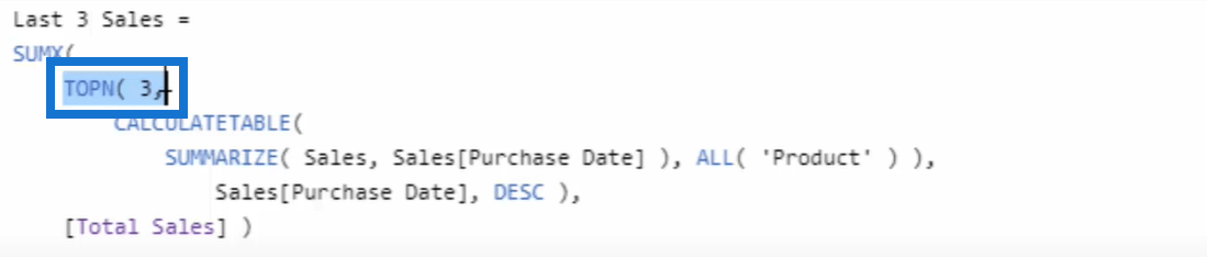基本上,這就是 TOPN 根據購買日期查找最近三筆銷售的工作。此外,DESC函數按降序對結果進行排序。