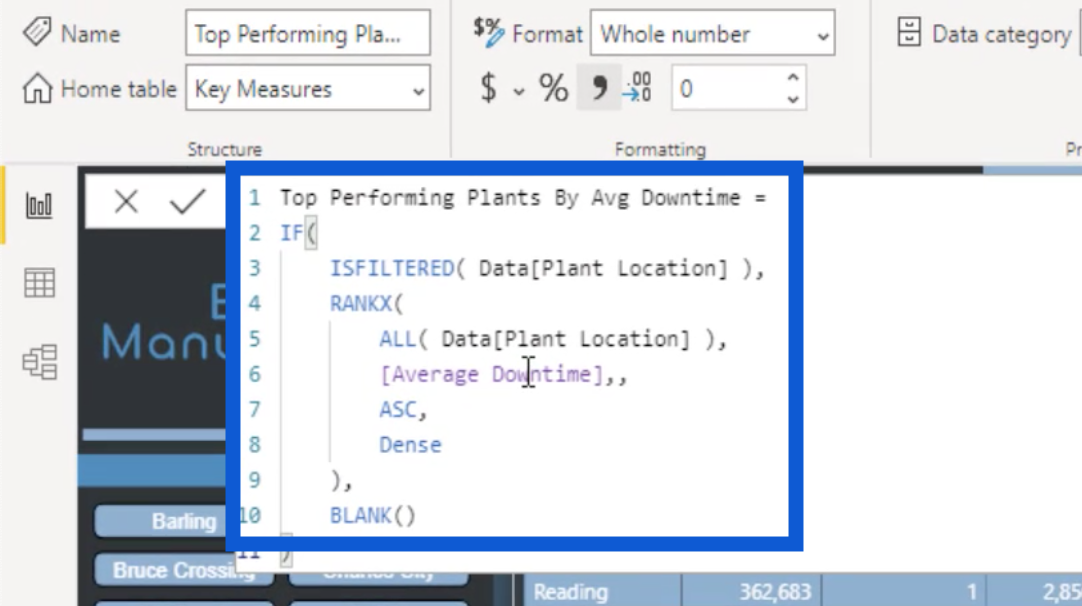 這是一個基本度量,它使用應用於每個工廠的停機分鐘數的日期的AVERAGEX 。這是我對植物進行排名時的主要依據。