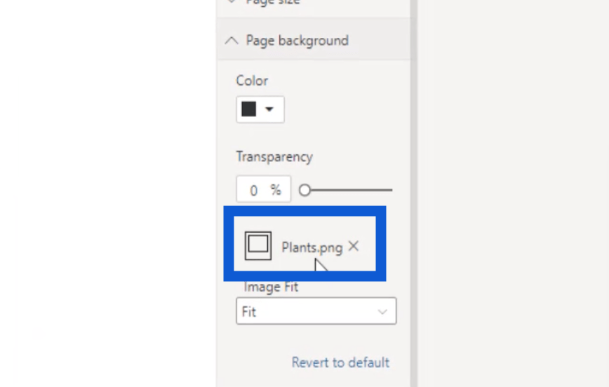 然後,我在每個頁面上都上傳了這個背景。由於我將此頁面的背景幻燈片保存為 Plants.png,您將在我的可視化窗格中的頁面背景下看到相同的文件名。