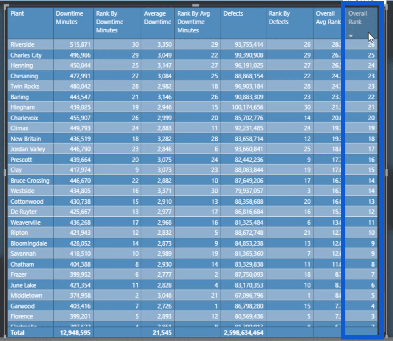 我將衡量標準稱為“停機時間表現最佳的工廠”。顯然,這個名字太長了,不能用在視覺上。這就是為什麼我將列命名為按停機時間排名。