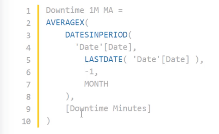 直接的 DAX 度量,它使用和LASTDATE減去一個月的所有這些都是在停機時間完成的。