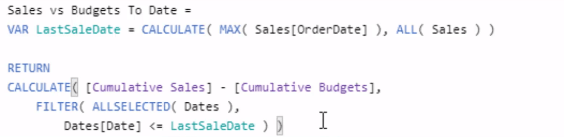 公式的第二部分是此計算的關鍵。它需要從銷售額中減去預算,但我們是在不同的環境中進行的,這正是 CALCULATE 函數使我們能夠做到的。此上下文將由LastSaleDate進行調整,因為我們只想計算到最後一個銷售日期。