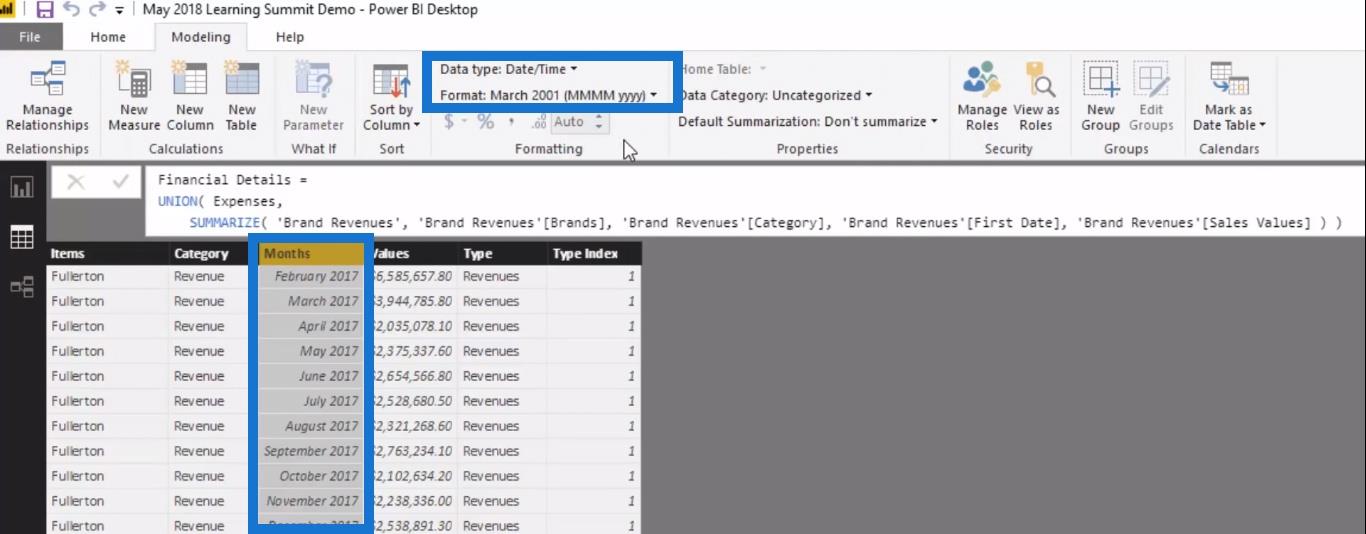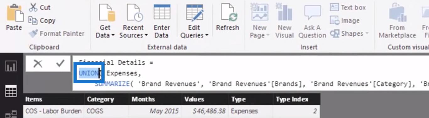 UNION是一個表函數,它將一個表附加到另一個表之上。通過使用UNION函數,我將Expenses附加到我剛剛創建的表的另一個表 ( Brand Revenues ) 上。我這樣做是因為我需要將這些列完全匹配以使UNION函數起作用。