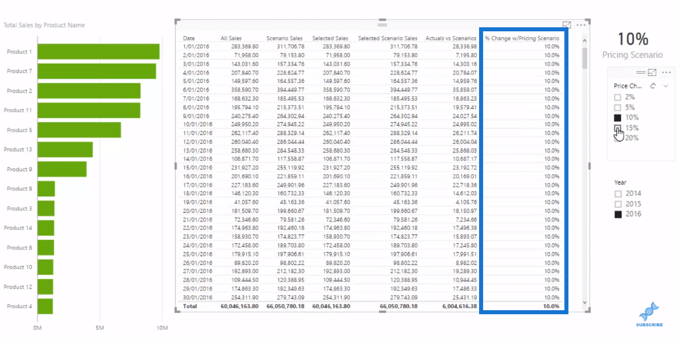 這使我們能夠選擇要運行多少價格變化並進行分析。然後,我們必須創建一個度量來獲取在切片器中選擇的價格變化百分比。