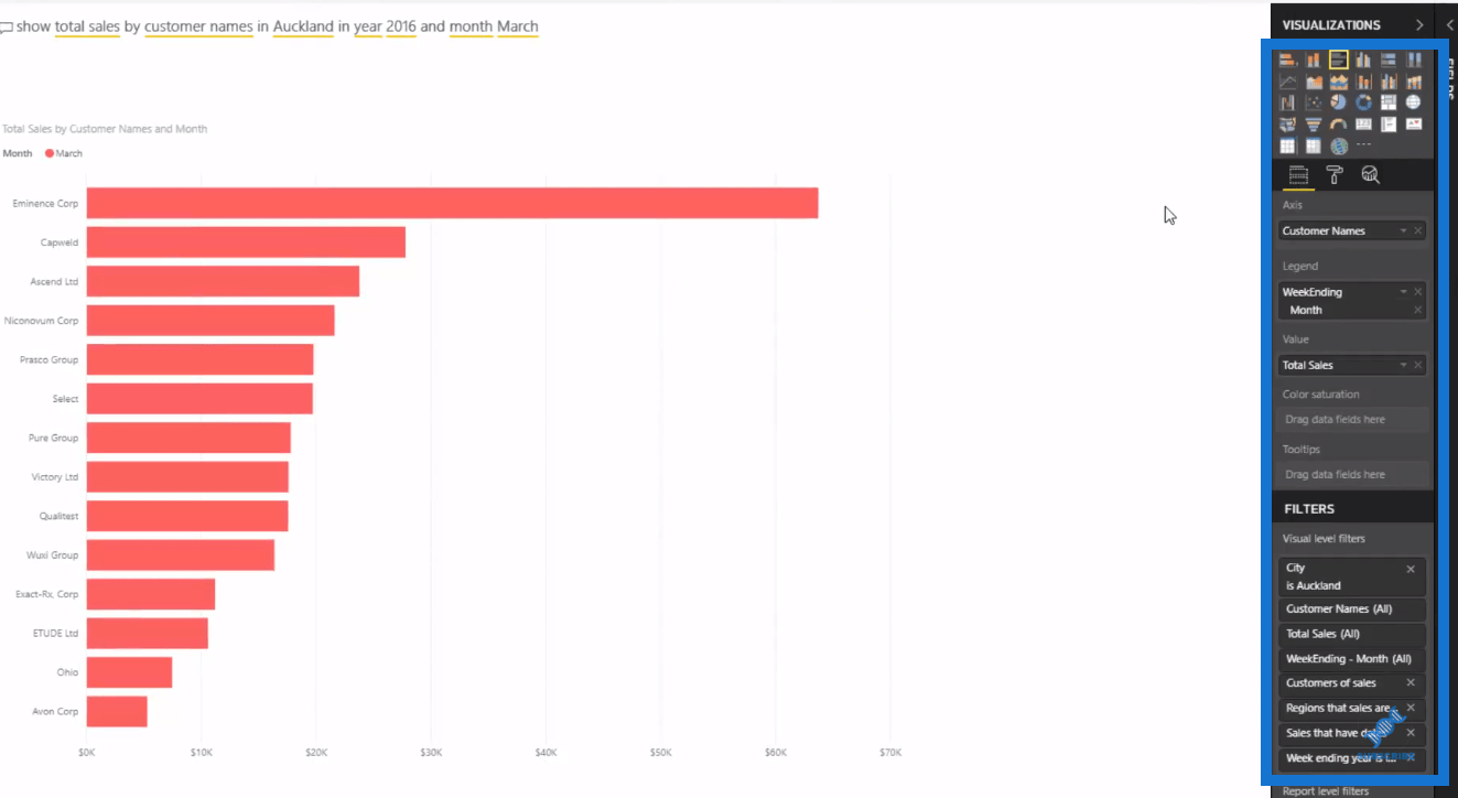 因此,如果我們在問題中添加“在奧克蘭”,它將過濾此數據並向我們顯示奧克蘭每個人的銷售額。同樣,這是可能的,因為我有一個城市維度,其中包括奧克蘭作為數據集所基於的城市之一。