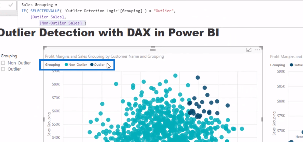這個計算是說IF SELECTEDVALUE (Outlier Detection Logic)是一個Outlier,那麼我們要返回Outlier Sales。如果不是,那麼我們返回Non-outlier Sales。