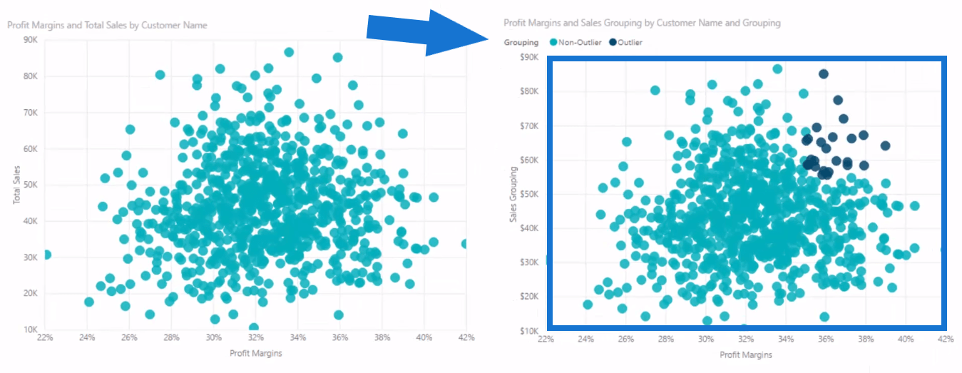 現在,如果我們查看這兩個圖表,第一個圖表(左)顯示的內容與第二個圖表(右)完全相同,只是我在第二個圖表中創建了圖例或切片器過濾器,它顯示我們的異常值是什麼。