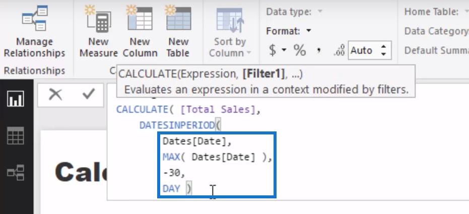我們將把這個衡量標準稱為 Running Total 30D Alternative。同樣,我們將計算總銷售額,但我們將使用名為 DATESINPERIOD 的函數而不是 FILTER。