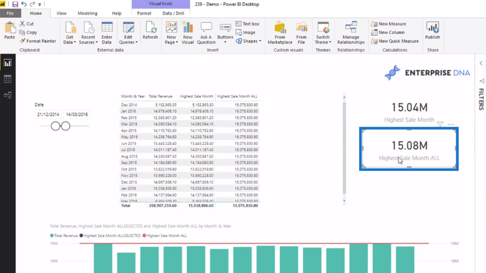 Highest Sale Month ALL度量中的結果是不同的,因為它沒有考慮我在Date過濾器中選擇的上下文。它實際上是在查看每個月的時間。