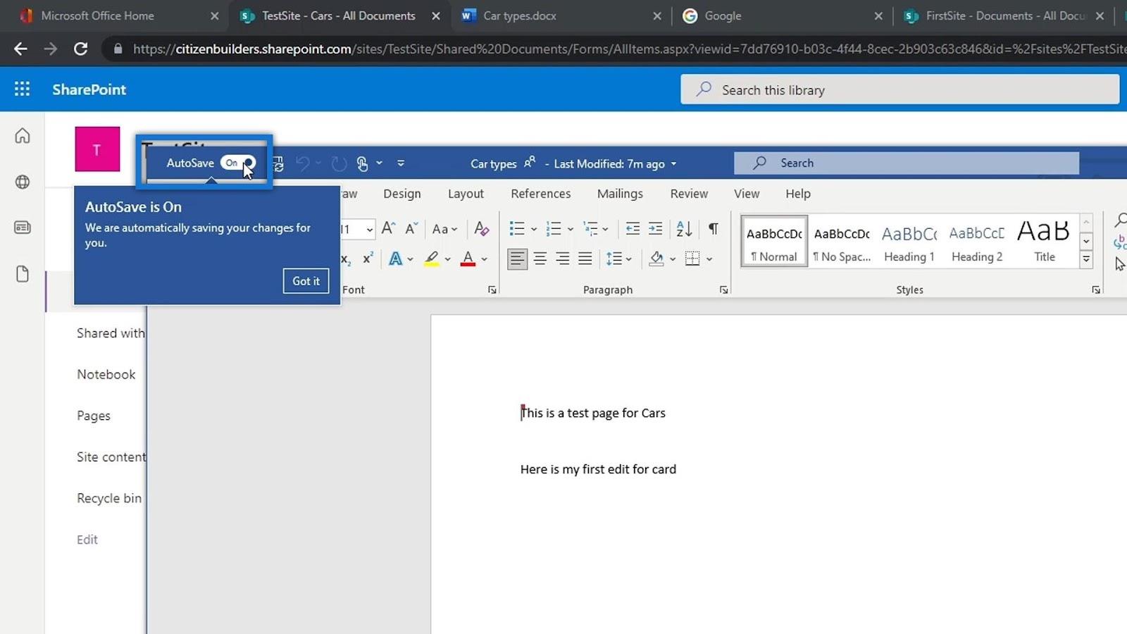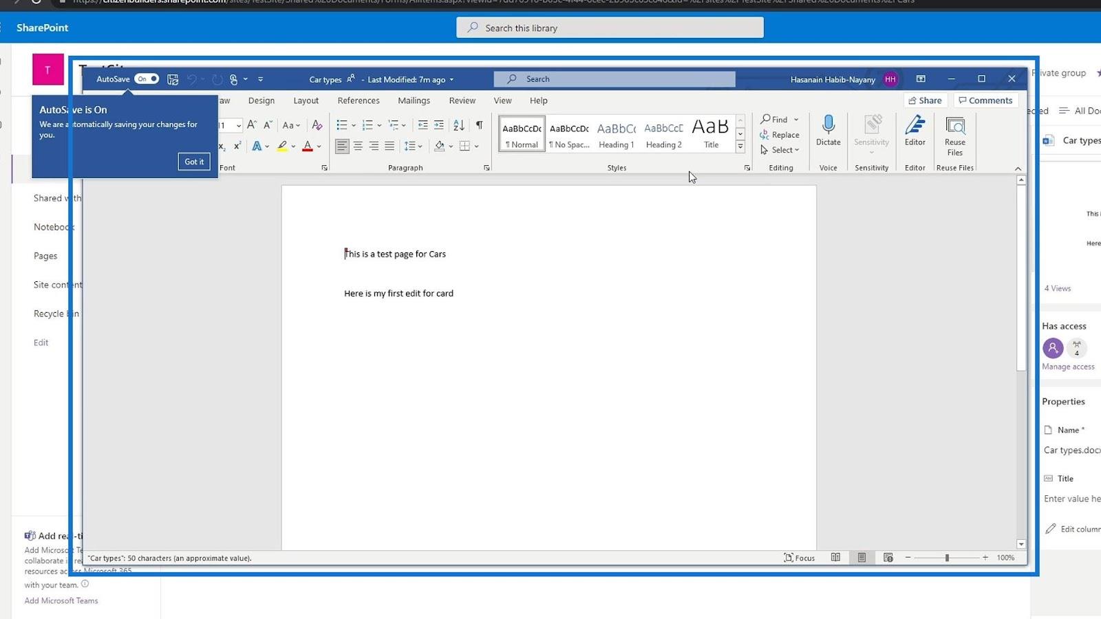 如果我們回到我們的測試站點,我們可以在列表中看到新添加的 word 文件。如果看不到,只需刷新頁面即可。我們不一定需要在桌面上上傳或創建文件並上傳。我們可以直接在我們的 SharePoint 網站上添加或創建它們。
