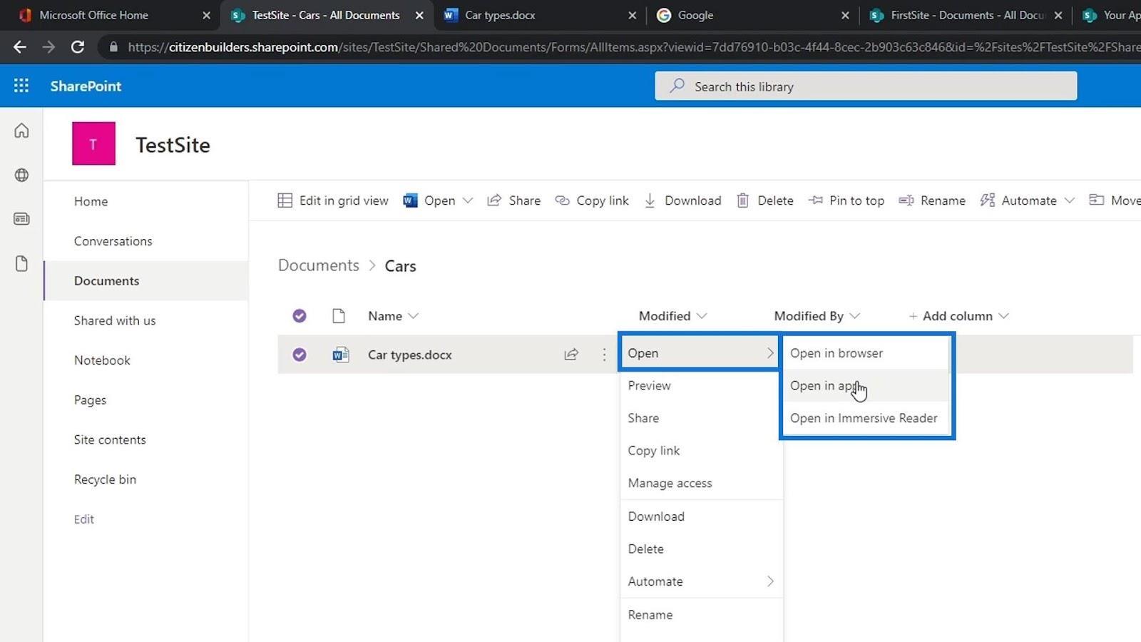 有 3 種方法可以打開文件。通過使用 Microsoft 產品 SharePoint,它可以與其他 Office 產品進行良好的通信。默認情況下,如果我們打開 Word、Excel 或 PowerPoint 文件,其在線版本將自動打開。