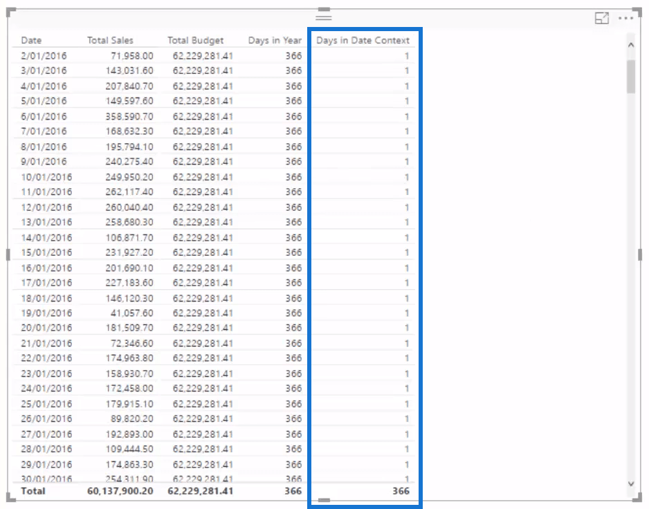 我們將把剛剛創建的度量值拖到我們的表中。我們現在可以看到一年中的天數,但我們仍然需要弄清楚如何將 1 除以 366,然後將其乘以我們的總預算。