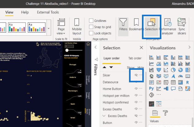 現在我們不想在報告頁面上看到第二個切片器。所以我們將通過轉到“視圖”選項卡隱藏它,然後轉到“選擇”,然後單擊切片器的眼睛圖標。