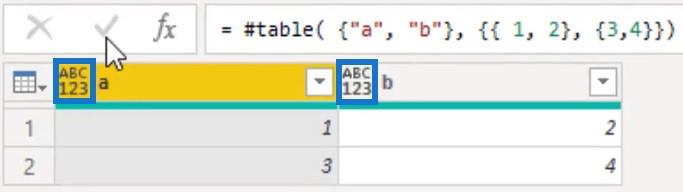 在公式中,第一列稱為a並且具有數字類型。第二列名為b,數據類型為文本。還有 3 個包含數字和文本的記錄值。您還可以看到每列圖標及其相關類型。