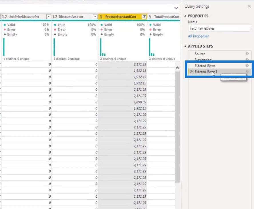 例如,我在此表中隨機創建了一個過濾器,只是為了向您展示一旦我們創建了這些過濾器,我們將能夠在“應用步驟”面板中看到它們。